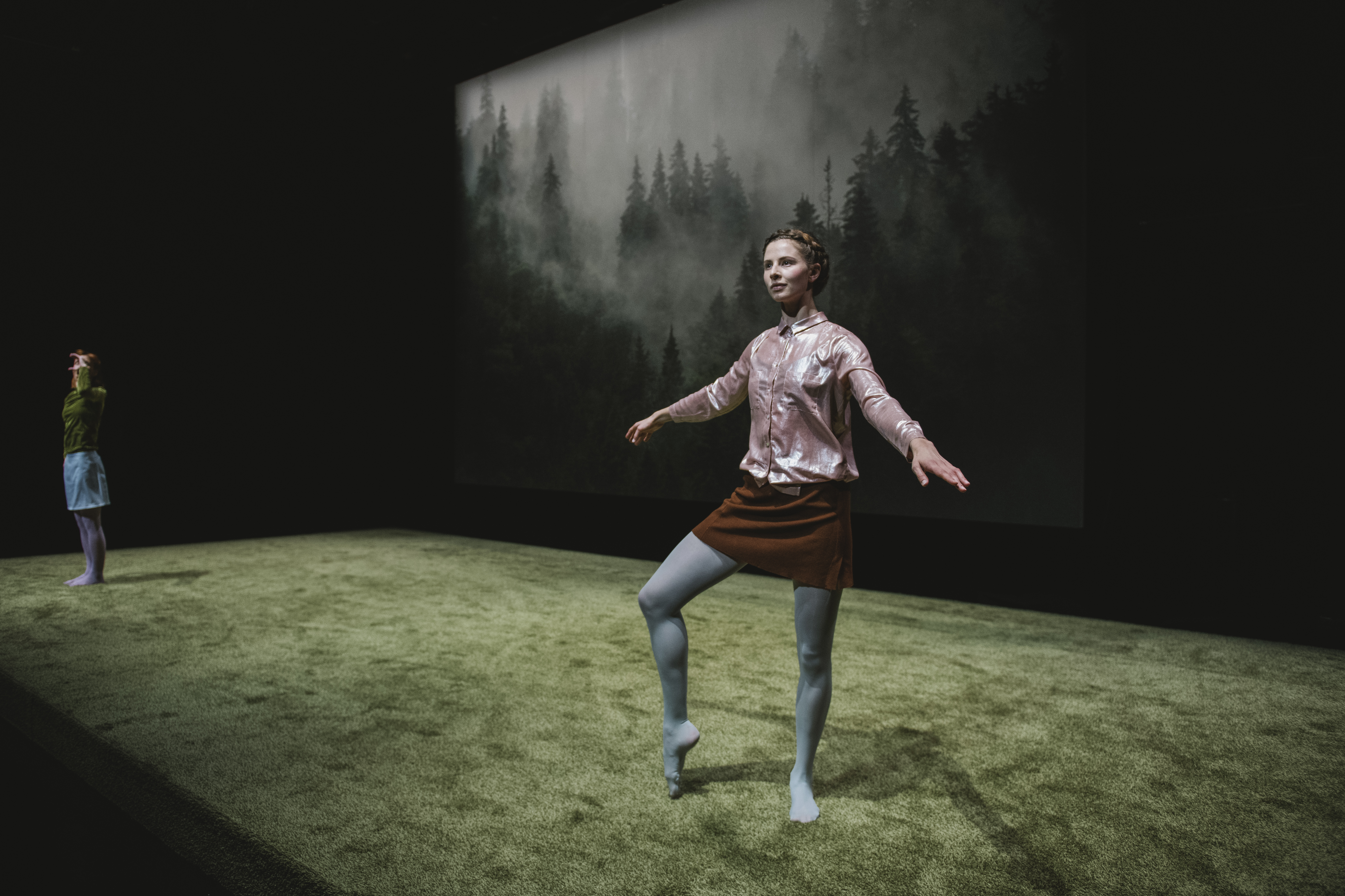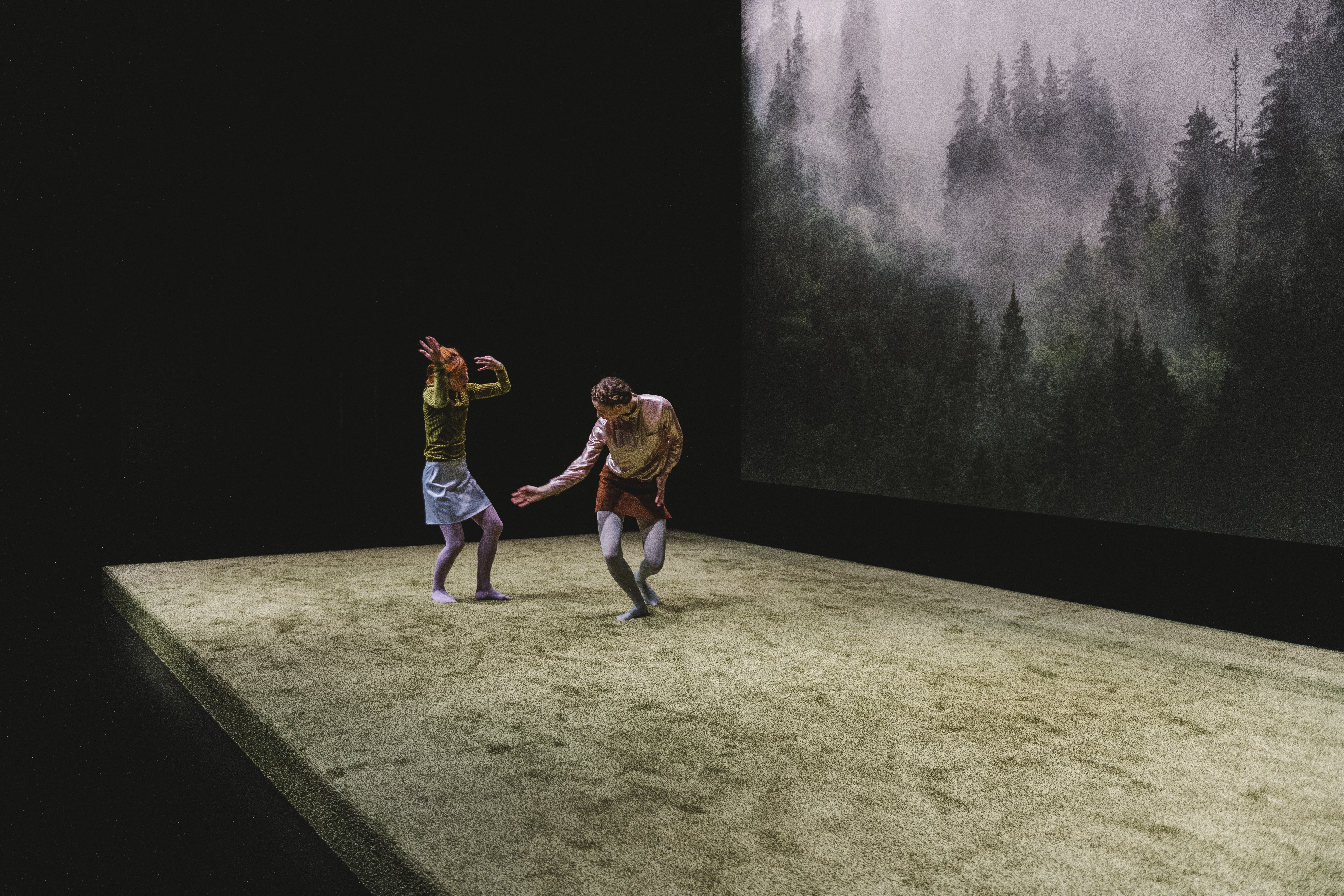 In Red.Forest a new interpretation of „Red Riding Hood and the Big Bad Wolf“ is presented, which in part makes use of the mime-language used in the traditional ballet version and then distorts it. At the same time text fragments by the French philosopher and writer,Georges Bataille, are to be heard, which create levels of ambiguity when contrasted with the straightforwardness of the Brothers‘ Grimm tale.On the stage the two dancers struggle with fixed attributions, fall victim to Bataille’s surrealist story and have to try to assert their own identity within the narrative. Anyone who knows the Grimm fairy-tale will discover in the piece how Red Riding Hood grows up and will discover new perspectives on the well-known tale.